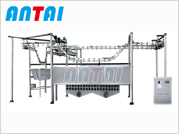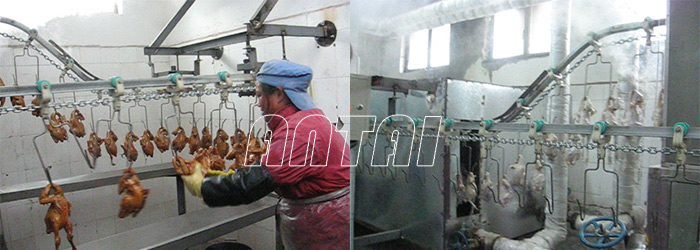 懸掛油炸雞線采用鏈條吊掛傳送系統,有六個工作區分別有雞掛線區、上糖區、瀝糖區、油炸區、瀝油風冷區、下線區;懸掛方式有掛鉤是和炸框’式。